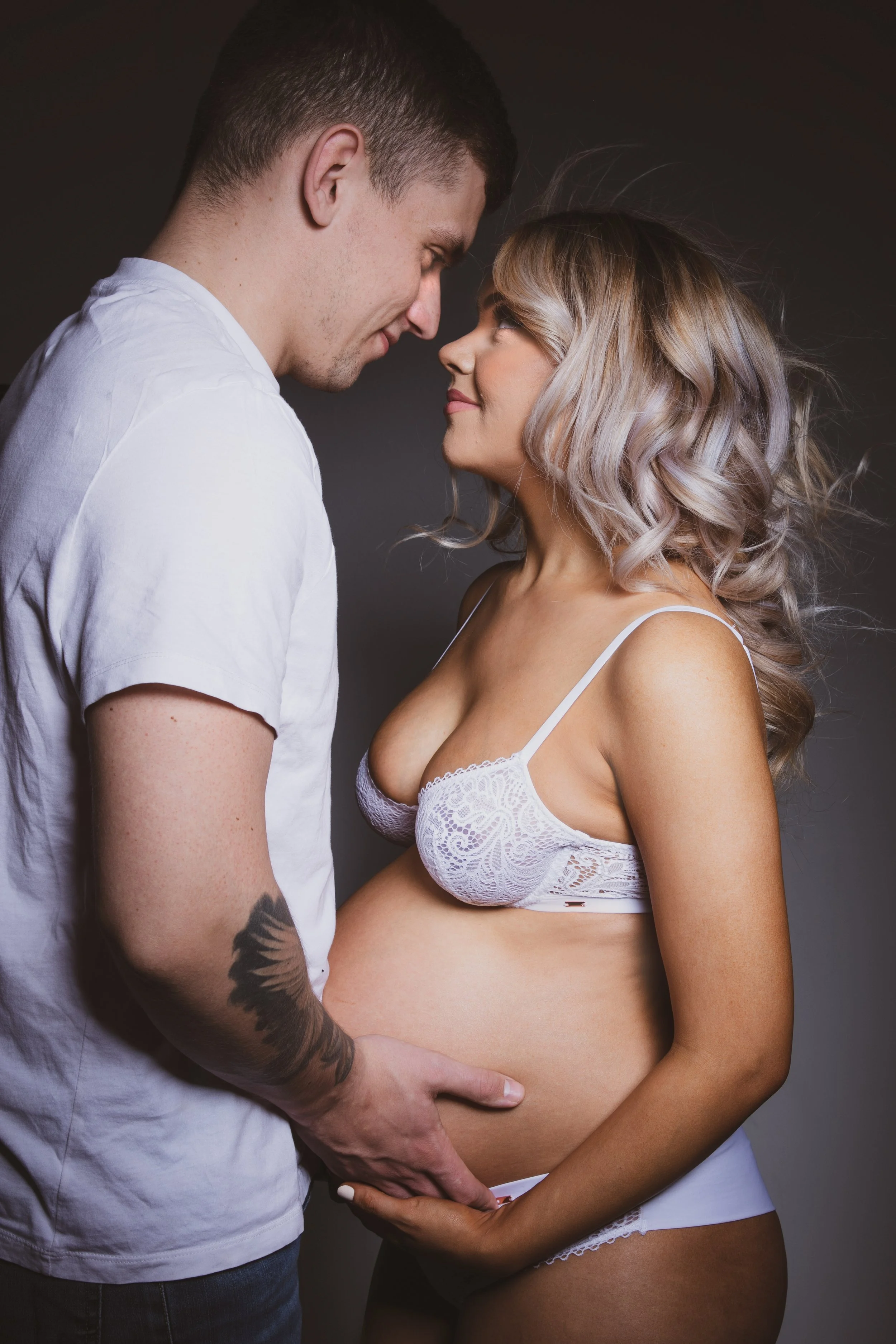 A pregnant woman and a man face each other, with the man's hand on the woman's belly. They are looking into each other's eyes. The woman has curly blonde hair and is wearing white lingerie. The man has short brown hair and is wearing a white t-shirt.